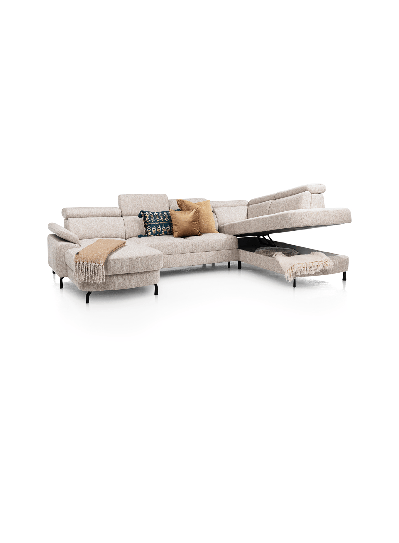 Besoin de rangement ? Composez un canapé d’angle avec une grande ottomane ou une chaise longue équipée d’un coffre de rangement intégré. Pratique pour avoir plaids, coussins ou magazines à portée de main… mais bien cachés.